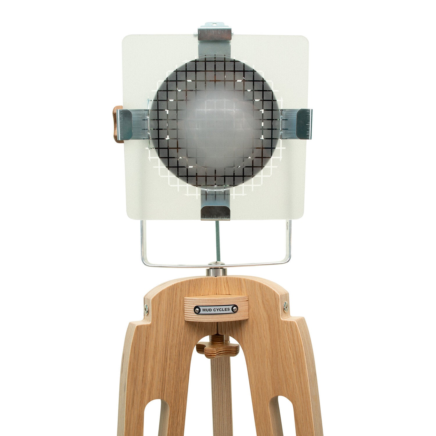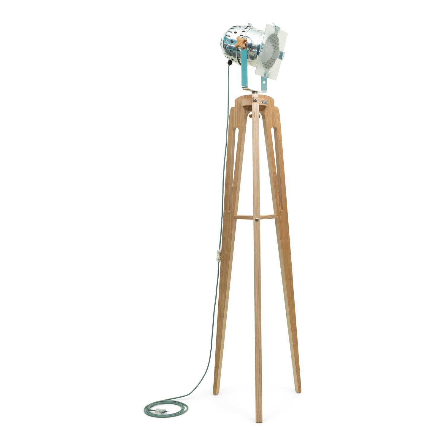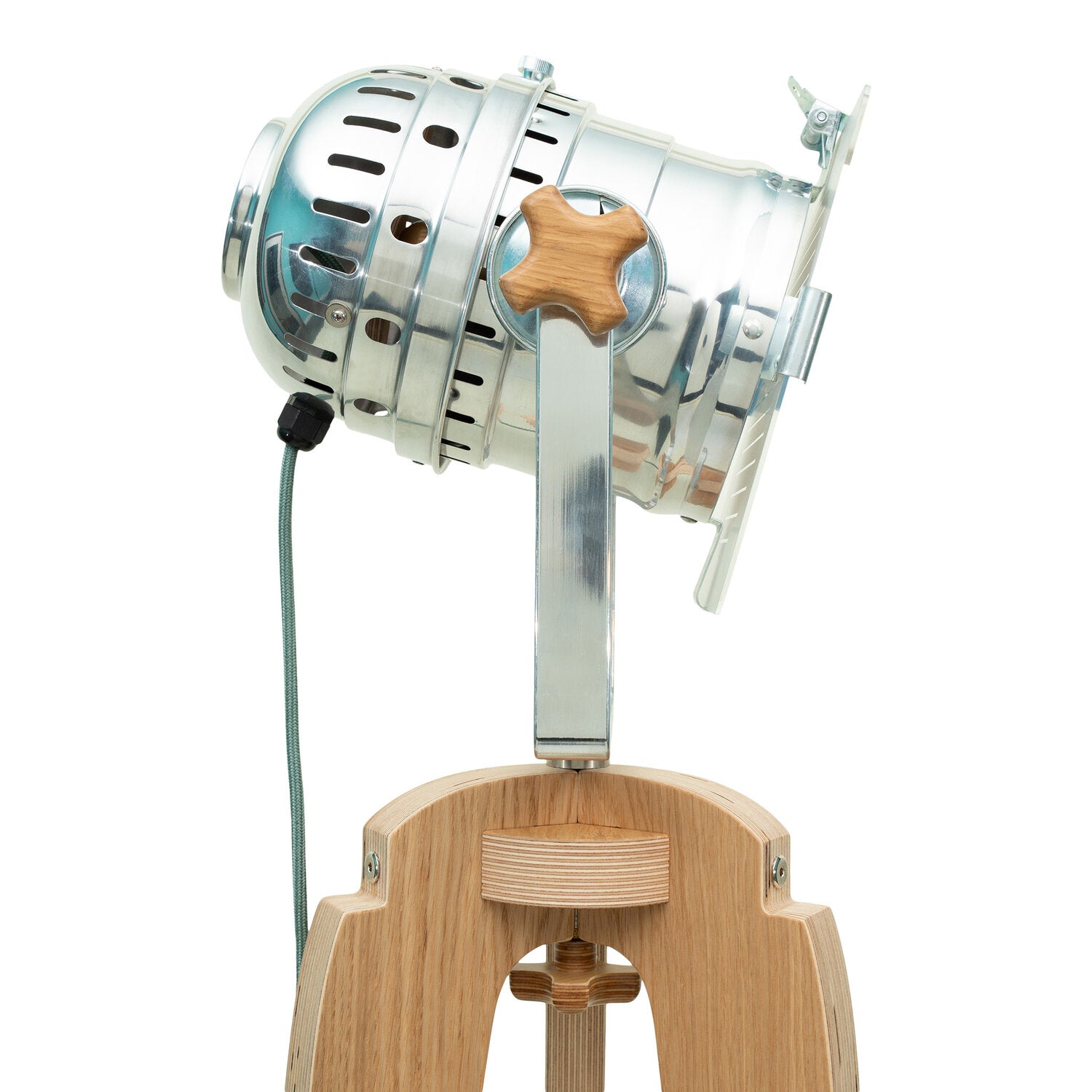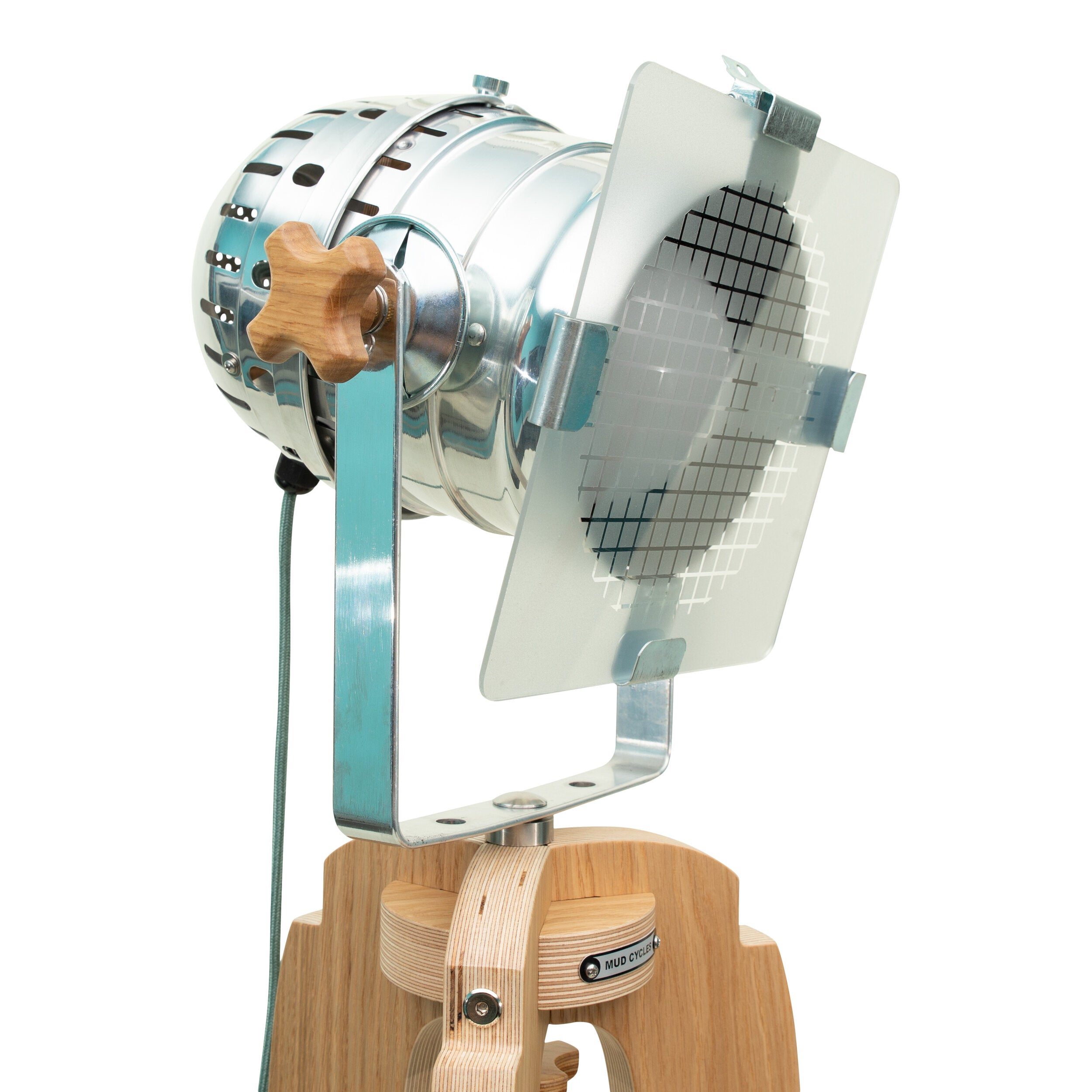 The Spot draws inspiration from classic cinema spotlights, utilizing authentic refurbished spotlights sourced from concert halls and theaters. This exceptional floor lamp is handcrafted in Portugal, incorporating both aluminum and wood materials.